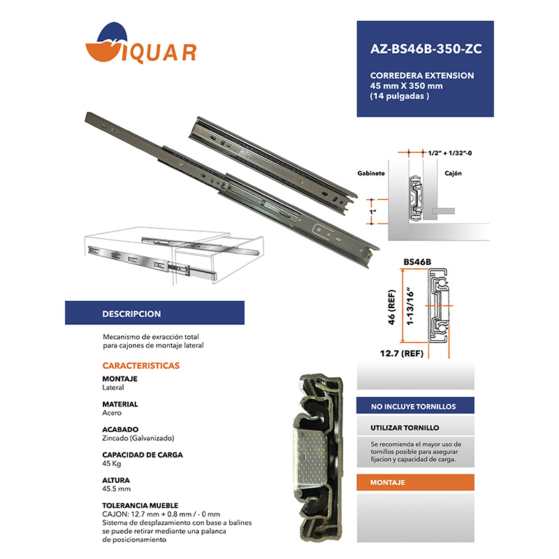 Corredera Extension 45mm ZP 1.0/1.0/1.2mm  18"(350MM)Corredera Extension 45mm ZP 1.0/1.0/1.2mm 18″(350MM)